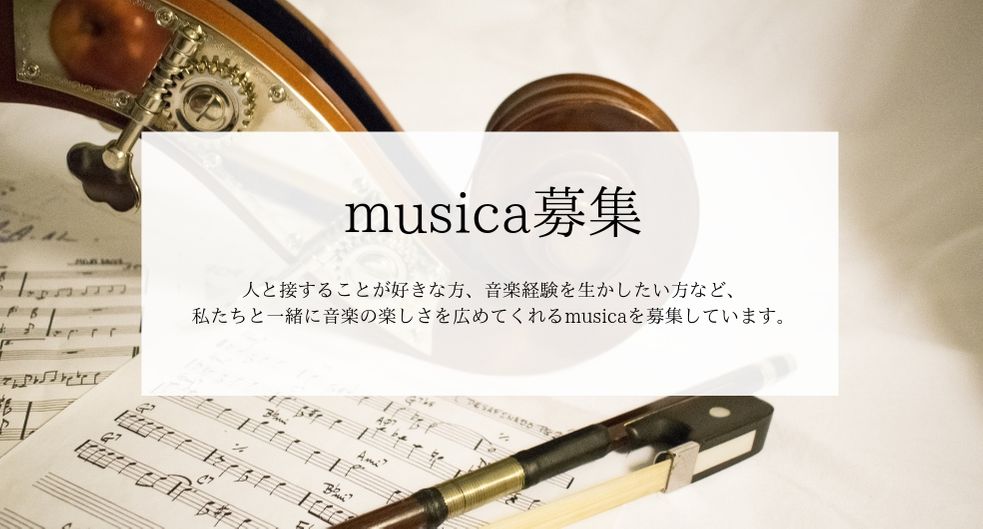 musica募集 雇用形態業務委託報酬1時間につき4,000円交通費実費支給その他手当勤務地依頼者の指定に準ずる資格学歴不問出張依頼経験不問特定の音楽分野において音楽大学卒業程度の能力をお持ちの方 応募フォームへ